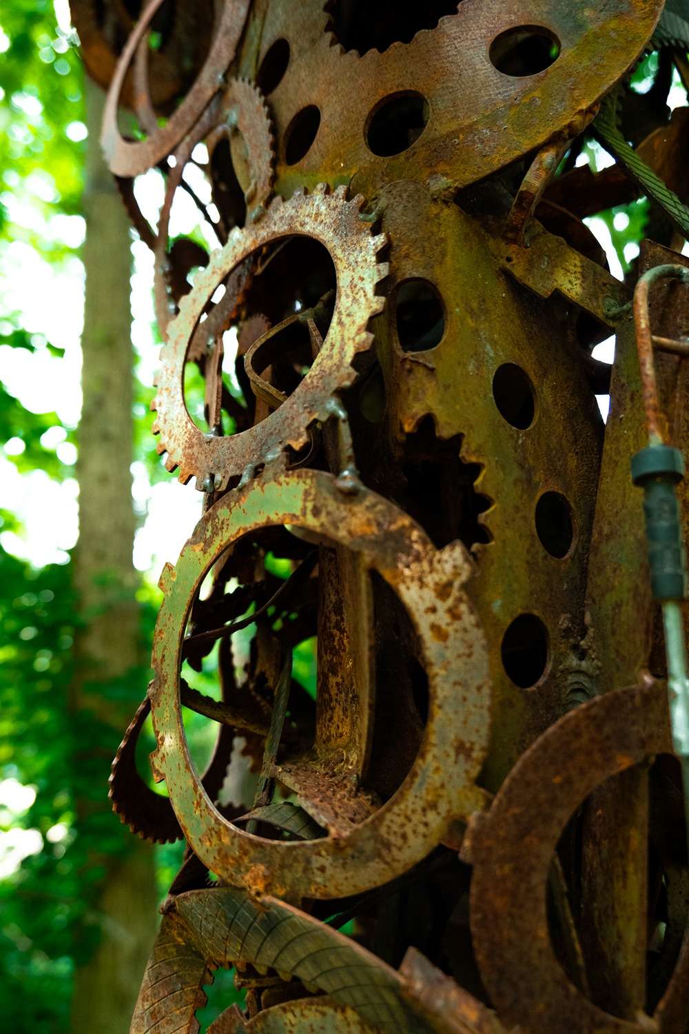 Delightfully I explore the composite of the clutch disc as dictated by each of the discs in composition. This piece is configured to vibrate or rock gentling by winds that transit from the inner and outer, allowing for free passage of the current. The void and solid collect dust and later patinated rainfall amassing energy through time. The cast shadow evokes latent energy from the mater and the power of spoken words into the metal. It is no coincidence that sculpting ‘Miles’ was actualized in the blacksmith shop’s rare yard; it resonates with the elements – earth, wind, and fire, the divine and derived intervention, the latent energy that propelled this sculpting. The Sculptor rhythmically dances to music by hammering and shaping the clutch discs from the anvil. At the same time, heat energy is generated electrically as the mig-wire welds the clutch discs into a web of forms as the sculptor sweat cools the metal. All the clutch discs repurposed in the piece are my payment for cleaning Larry’s Shop at the close of his business. The Title “miles” metaphorically speaks to the horizontal displacement of objects and their fruition into collectable art pieces when repurposed.
