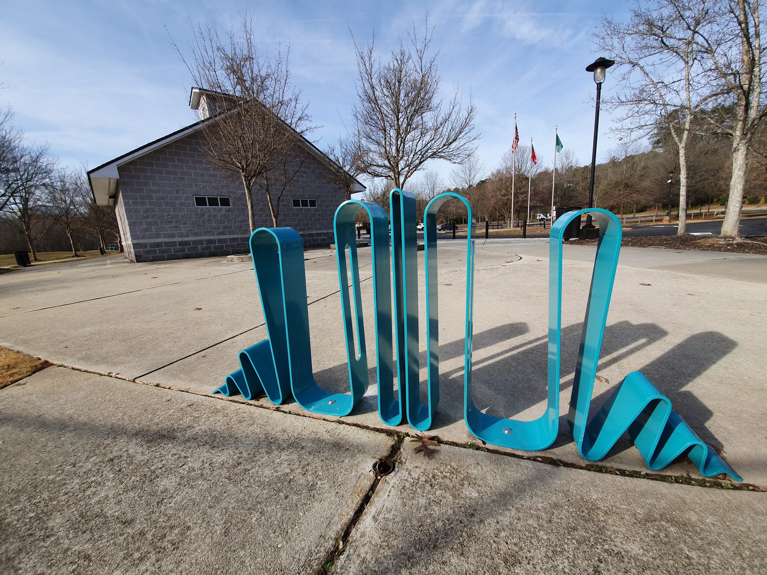 The Roswell bike rack by Jared Weinstein is a beautiful and welcoming sculpture helping to invite guests in as they enter from Alpharetta via Big Creek Greenway. The earthy green and cloudlike white reflect the natural surroundings of the letters, acting as a proud yet subtle indicator of this forested gateway to our city. The smooth, modern design is functional and stylish with a sleek shape that’s reminiscent of cyclists speeding around the curves.